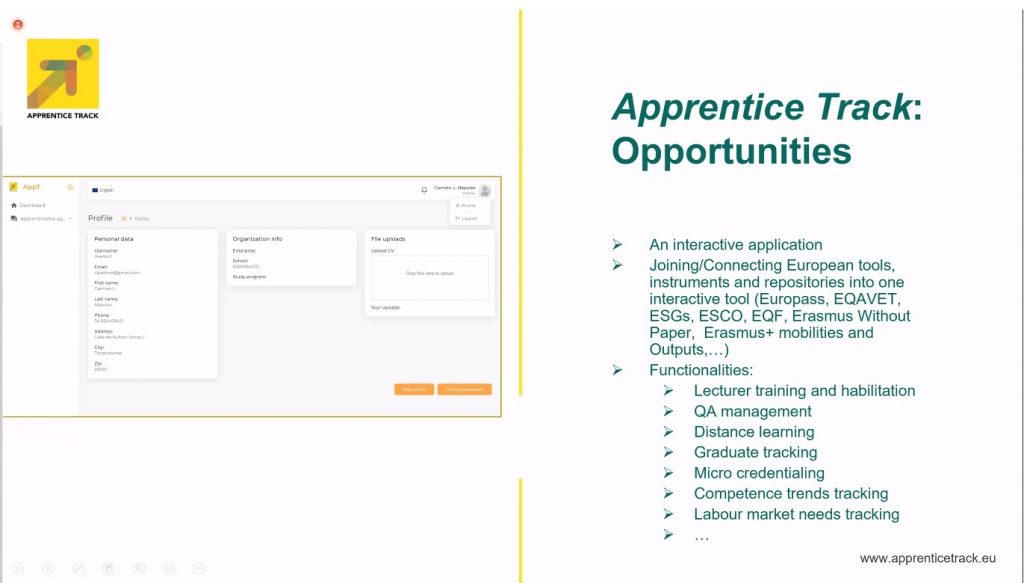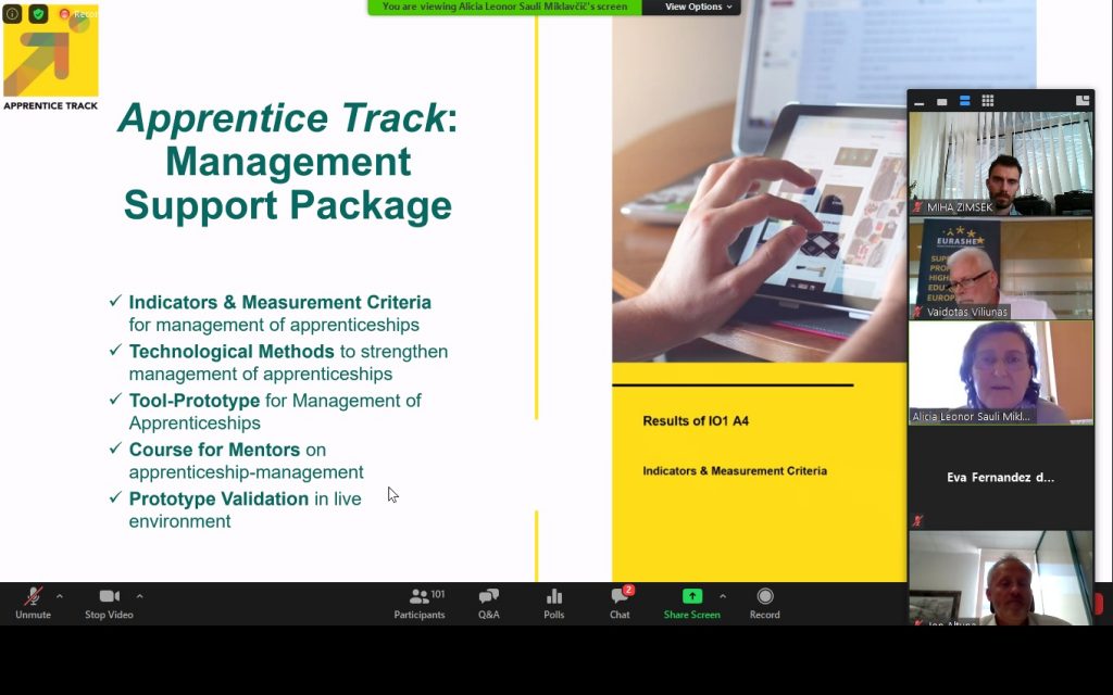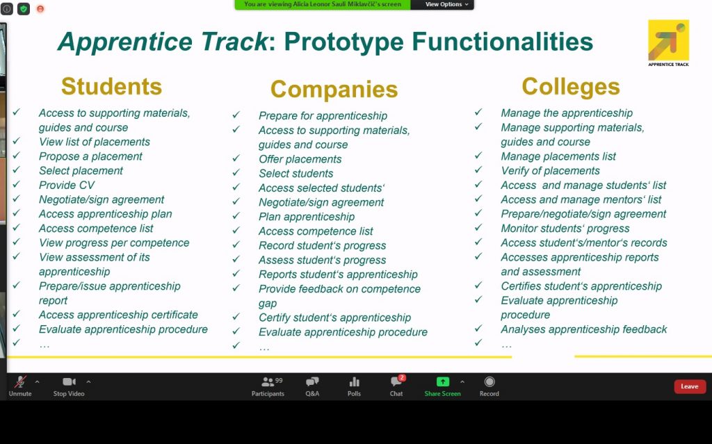 V uvodu je strokovni sodelavec EURASHE-ja Vaidotas Viliunas predstavili priročnika, ki sta bila razvita v okviru projekta Apprenticeship Q. Za tem je Alicia-Leonor Sauli-Miklavčič predstavila spletno aplikacijo za upravljanje PRI z nazivom ApprenticeTrack. V sklepnem delu spletnega seminarja je sledila panelna razprava med ključnimi deležniki na področju praktičnega izobraževanja.