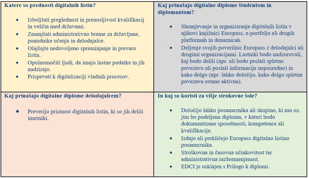 Digitalna listina je dokumentirana izjava, ki vsebuje trditve o osebi, ki jih izda izobraževalna organizacija po opravljenem izobraževanju oz. usposabljanju (sem sodijo tudi diplome). Vsebuje informacije o spretnostih in kvalifikacijah, kot določa Europass. EDCI zagotavlja varen, zaupanja vreden in odporen sistem proti goljufijam ter omogoča zasebnost in zaščito podatkov. Najpomembneje je, da je listine ene države članice mogoče razumeti in preveriti v kateri koli drugi. Učenci, delodajalci, izvajalci izobraževanja in usposabljanja ter drugi organi bodo lahko preverili, ali so spričevala in druge kvalifikacije veljavne in verodostojne. Z uporabo infrastrukture imajo institucije enostaven dostop do osnovnih informacij na spričevalu ali kvalifikaciji.